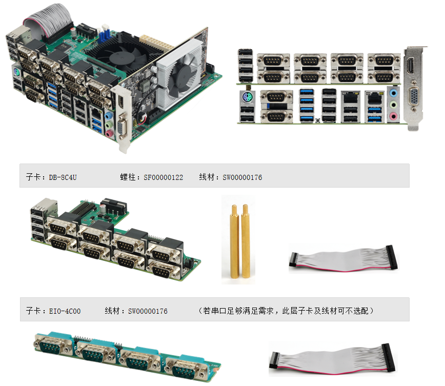 | 網卡 | 板載2*裕太微YT8521SC-CA千兆網卡 | 子卡DB-8C4U:4*USB2.0端口、8*COM端口 | |