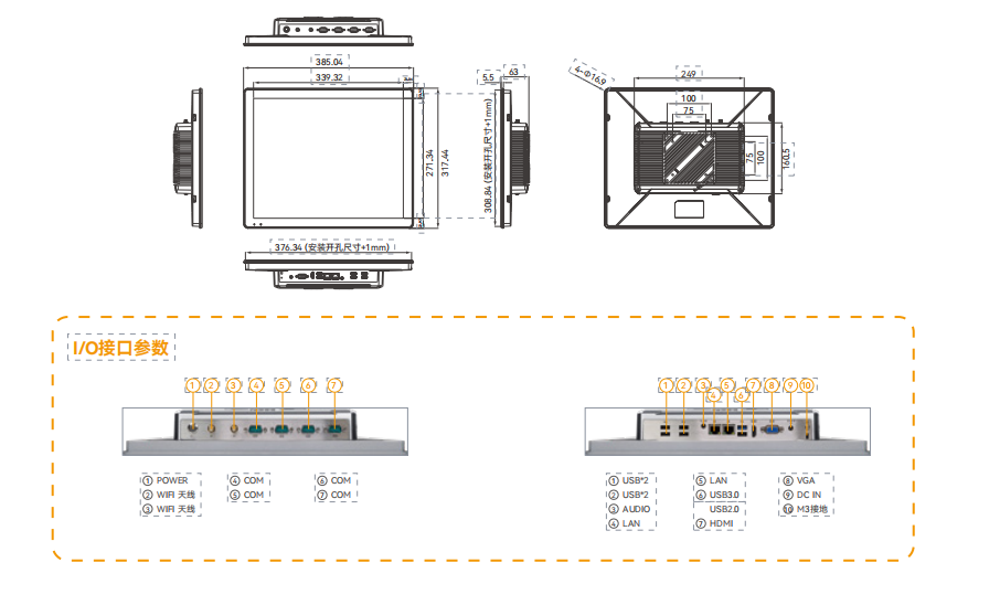 1*Audio端口 1*DP端口 1*HDMI端口 1*USB2.0端口 3*USB3.1端口 2*LAN 端口 1*DC IN端口 4*USB端口 1*M3接地螺孔 |